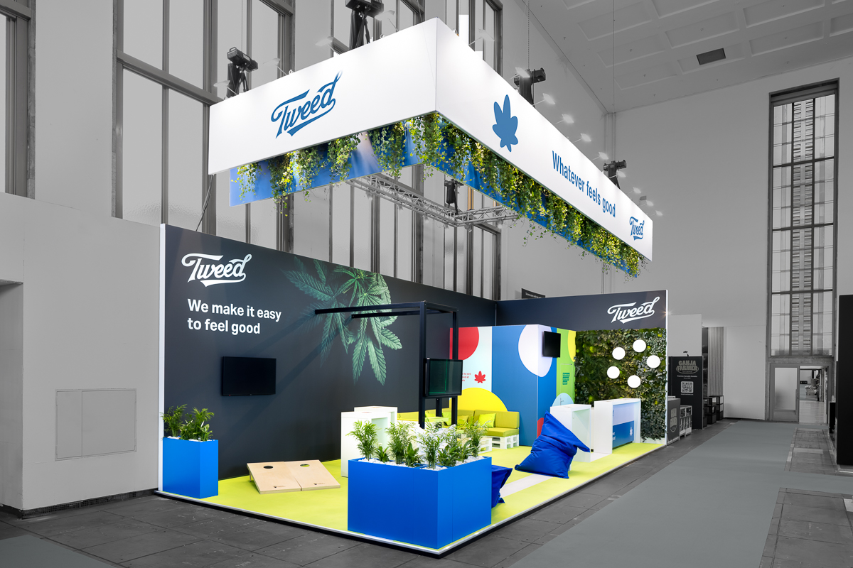 Mit viel Grün, echten Pflanzen, bequemen Sitzsäcken, Palettenmöbeln und einer offenen Lounge-Atmosphäre wurde der Messestand zum echten Hotspot in der Halle – urban, entspannt, direkt am Puls der Szene. Das perfekte Umfeld für gute Gespräche – und genau die richtige Bühne für eine starke Marke wie Tweed / Canopy Growth.