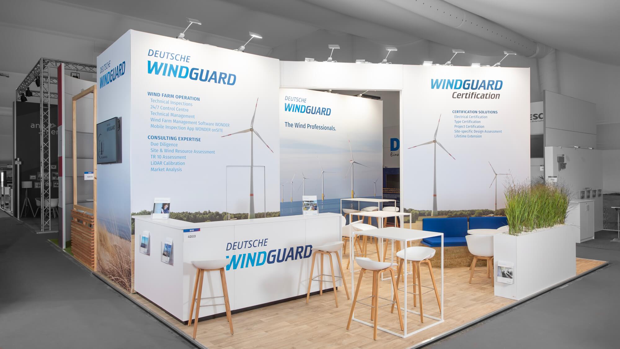 Die Deutsche WindGuard betrat die Messebühne mit einem bewährten Konzept, das bereits auf der WindEnergy in Hamburg und WindEurope in Kopenhagen ein Eyecatcher war. Dieses Mal haben wir es auf 48 m² adaptiert. Ausgestattet mit vielen Sitzbereichen waren perfekte Fachgespräche jederzeit parallel möglich. Ein helles, freundliches Ambiente mit Gräsern, Holz und maritimen Akzenten sorgte für eine angenehme Atmosphäre. Das Ergebnis? Ein überaus zufriedener Aussteller!