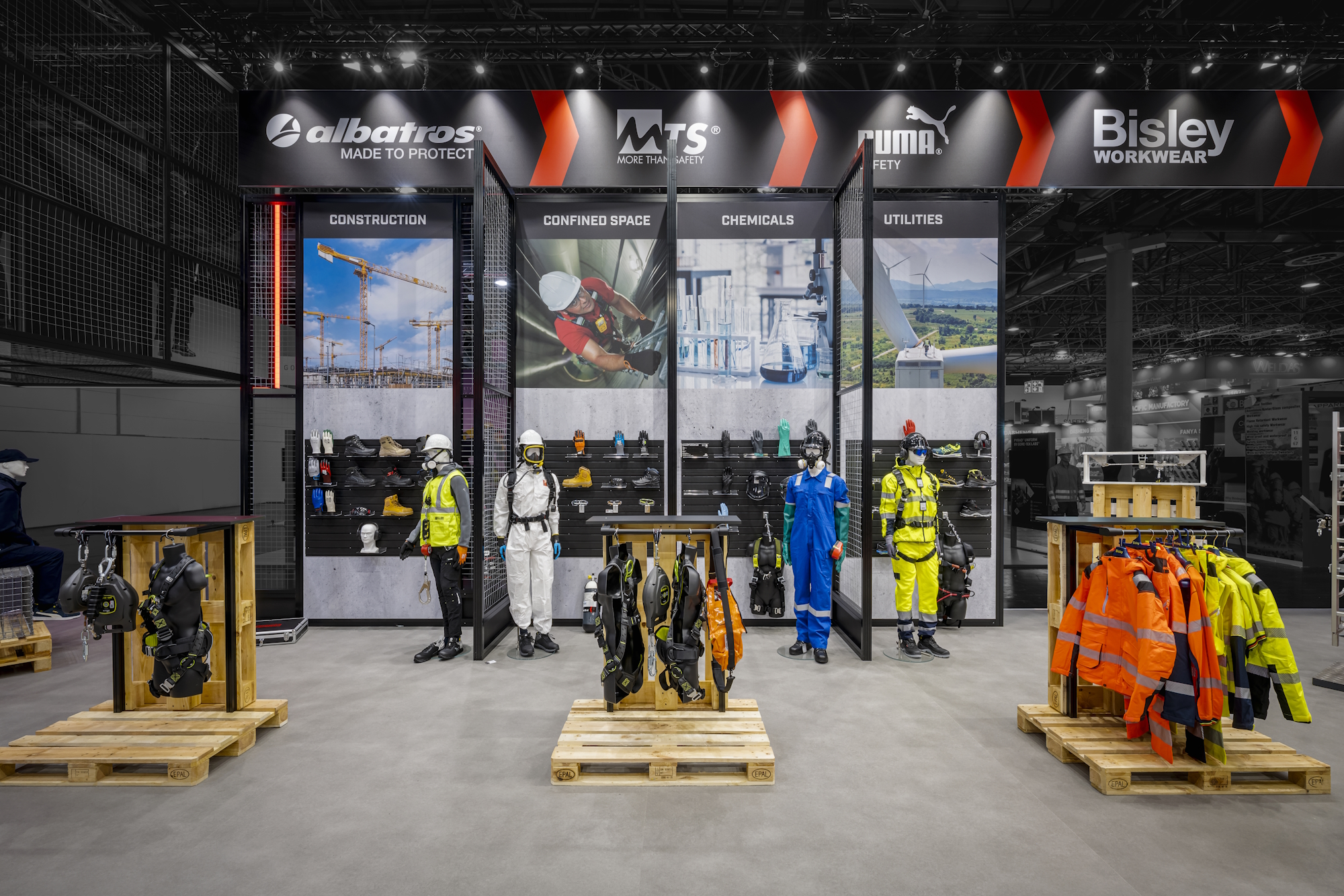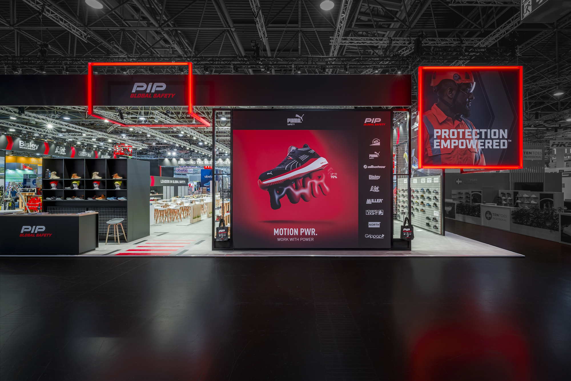 Auf dem Stand: ein maßgeschneidertes Showroom-System – für alle Produkte „from Head to Toe“. Smarte, individuell von uns neu entwickelte und im 3D-Druck bei uns gefertigte Ablage- und Hängesysteme für Kleidung sowie Präsenter für Kleinteile wie Ohrstöpsel und Brillen. Shop-Feeling total, dazu großzügige Kommunikationsbereiche. PUMA SAFETY – von PIP produziert und vertrieben – wurden neben weiteren und eigenen Produkten prominent inszeniert. Der Kunde und die Besucher waren begeistert – so soll es sein!