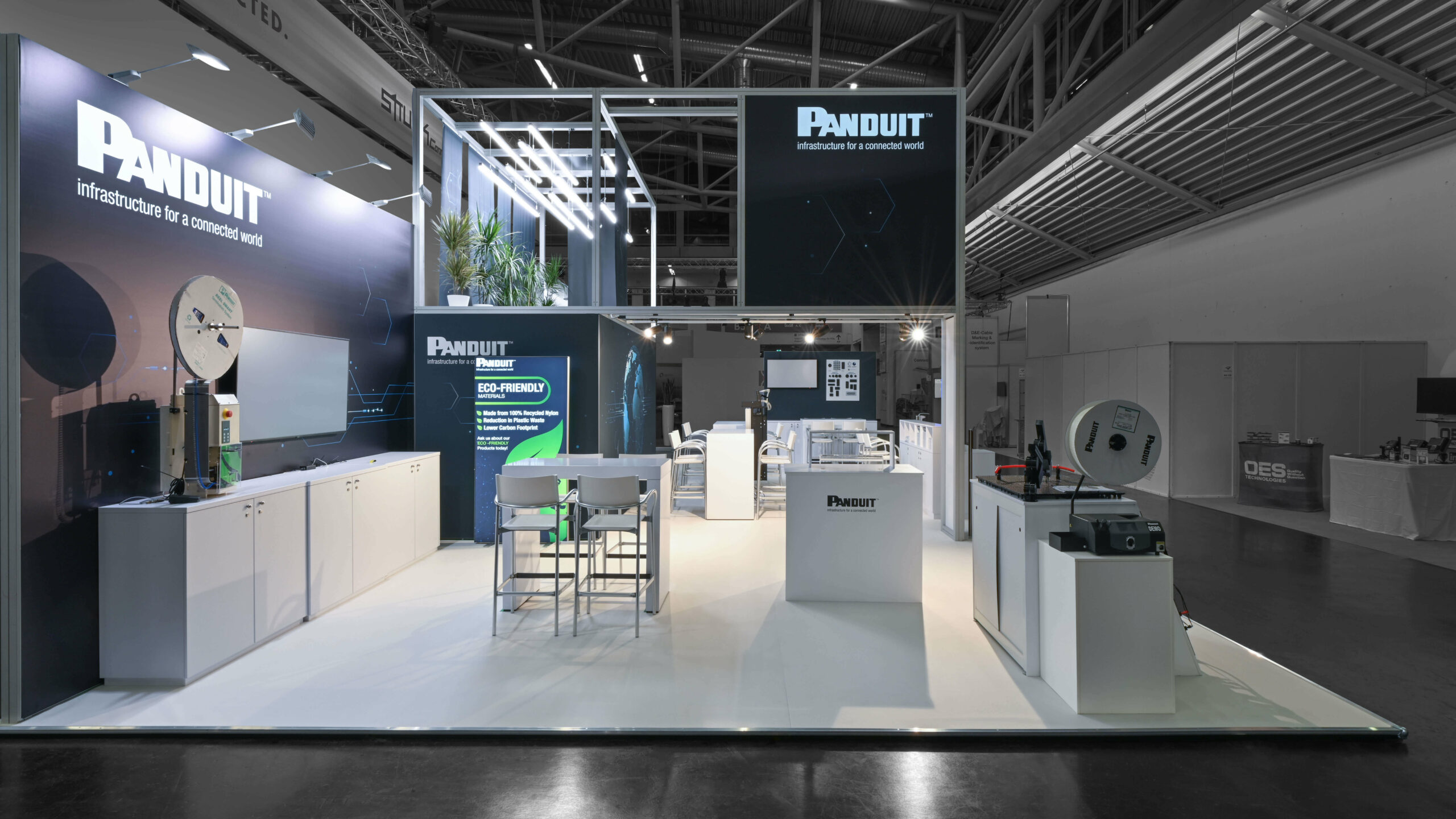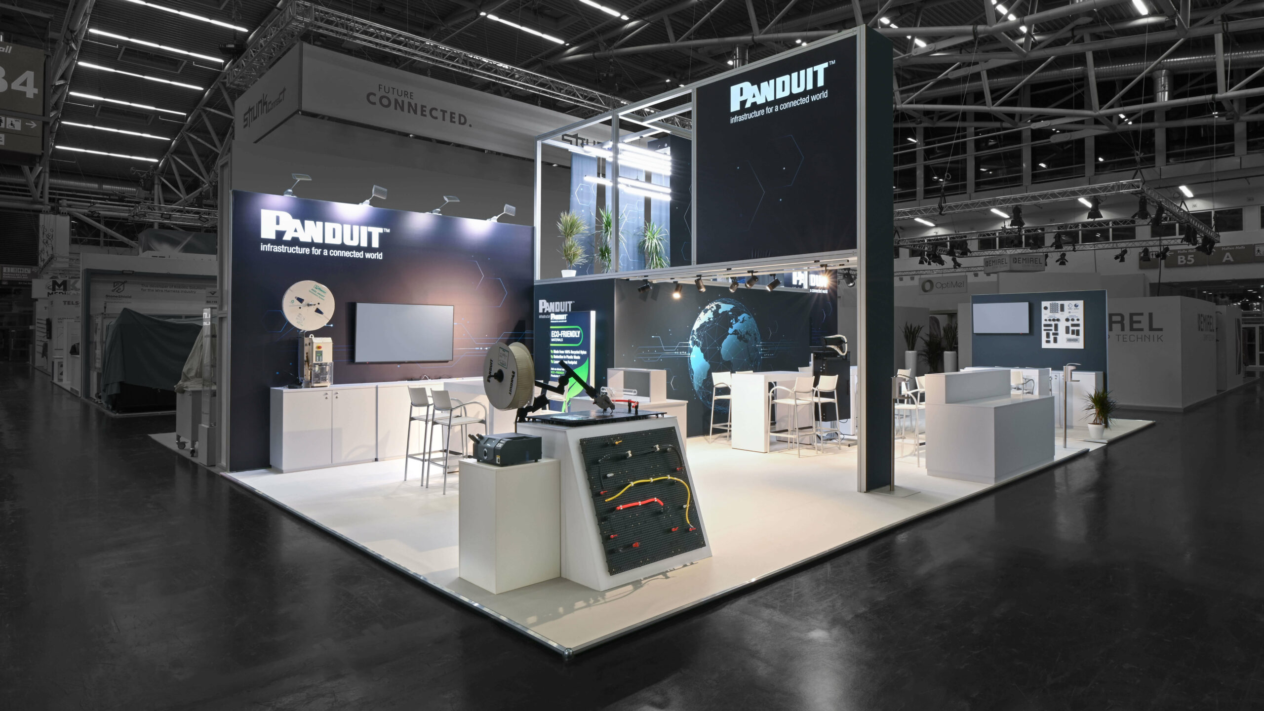 Auf 98 Quadratmetern zeigte sich der Messeauftritt von Panduit in klassischer Eleganz. Ein gutes Beispiel dafür, dass eine einfache Bauweise und zeitgemäßes Design nicht konkurrieren, sondern sehr gut harmonieren können: Das Standkonzept verzichtet auf aufwändige und teure Abhängungen und der Stand wurde in Rahmenbauweise (Framing) mit sichtbaren Statik-Bauteilen aufgeständert.