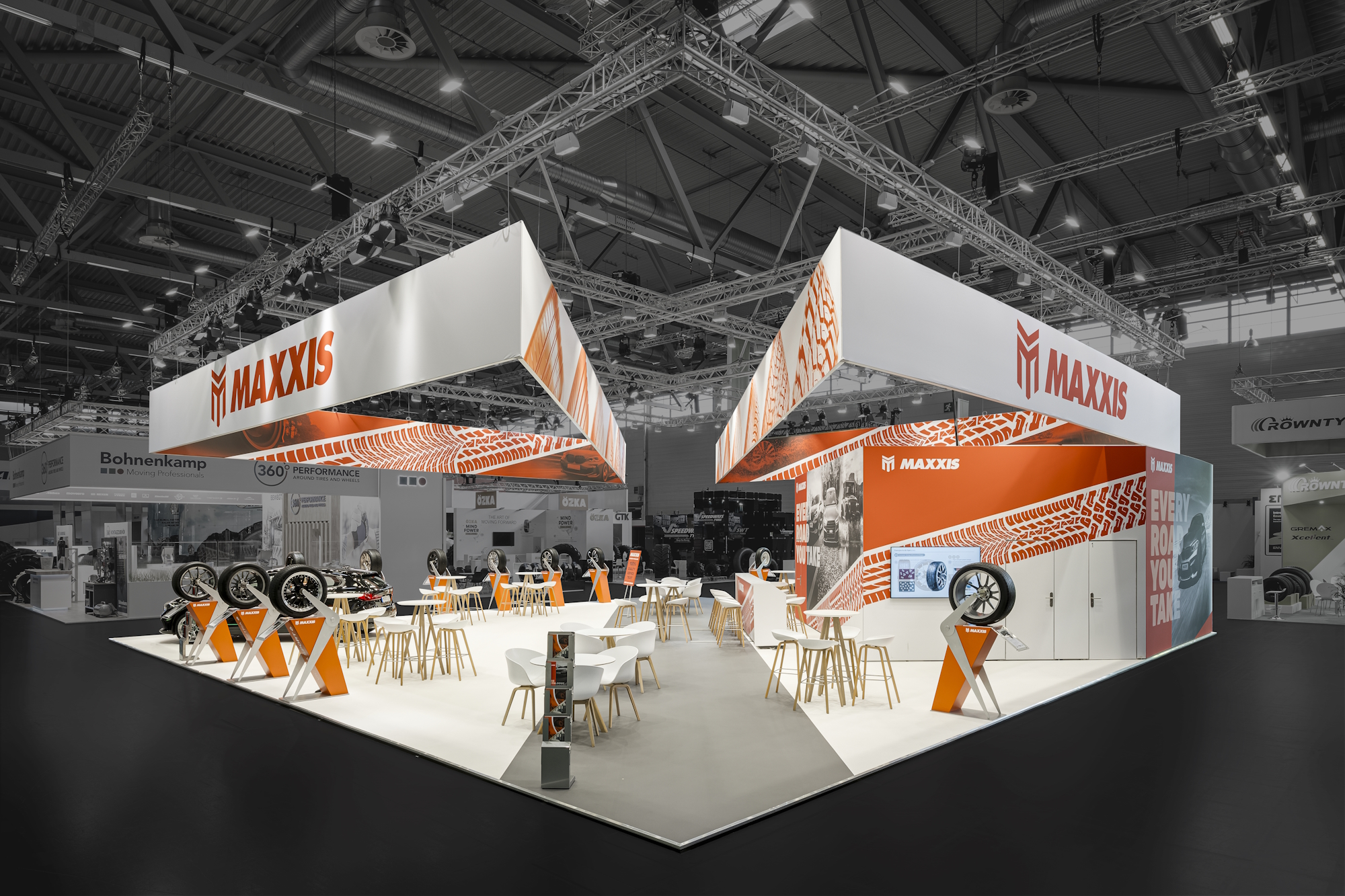 256 m² gehörten auf der The Tire Cologne, einer der größten Reifenmessen der Welt, unserem langjährigen Kunden Maxxis aus Taiwan. Ein unübersehbarer Auftritt in strahlendem Weiß und dynamischem Orange – ganz nach den CI-Vorgaben des Reifenherstellers, inklusive neuem Logo.